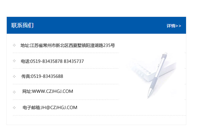 地址:常州市新北區友邦商務大廈1幢16、17層  電話:0519-85101652  傳真:0519-85112595  郵編:213022  網址:www_cz-jiayue_cn.hzsxpc.com  郵箱:xiajifengaa@163.com